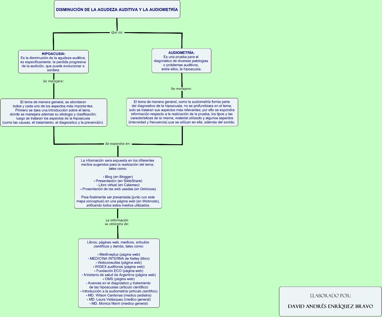 El siguiente mapa conceptual ilustra la manera en la que se abordó el tema que fue presentado en este sitio Web. Para ésto, se expone (en el mapa conceptual) una introducción sobre la hipoacusia y la audiometría, la información utilizada para desarrollar el tema, las herramientas cibernéticas utilizadas para ponerlo al acceso de la comunidad en general y las fuentes consultadas.